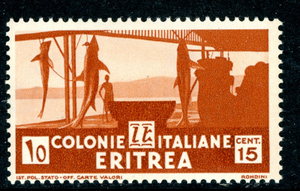 Italy 1934 Colony ERITREA 15¢ Orange Brown Shark Fishing Scott 161 MNH T776