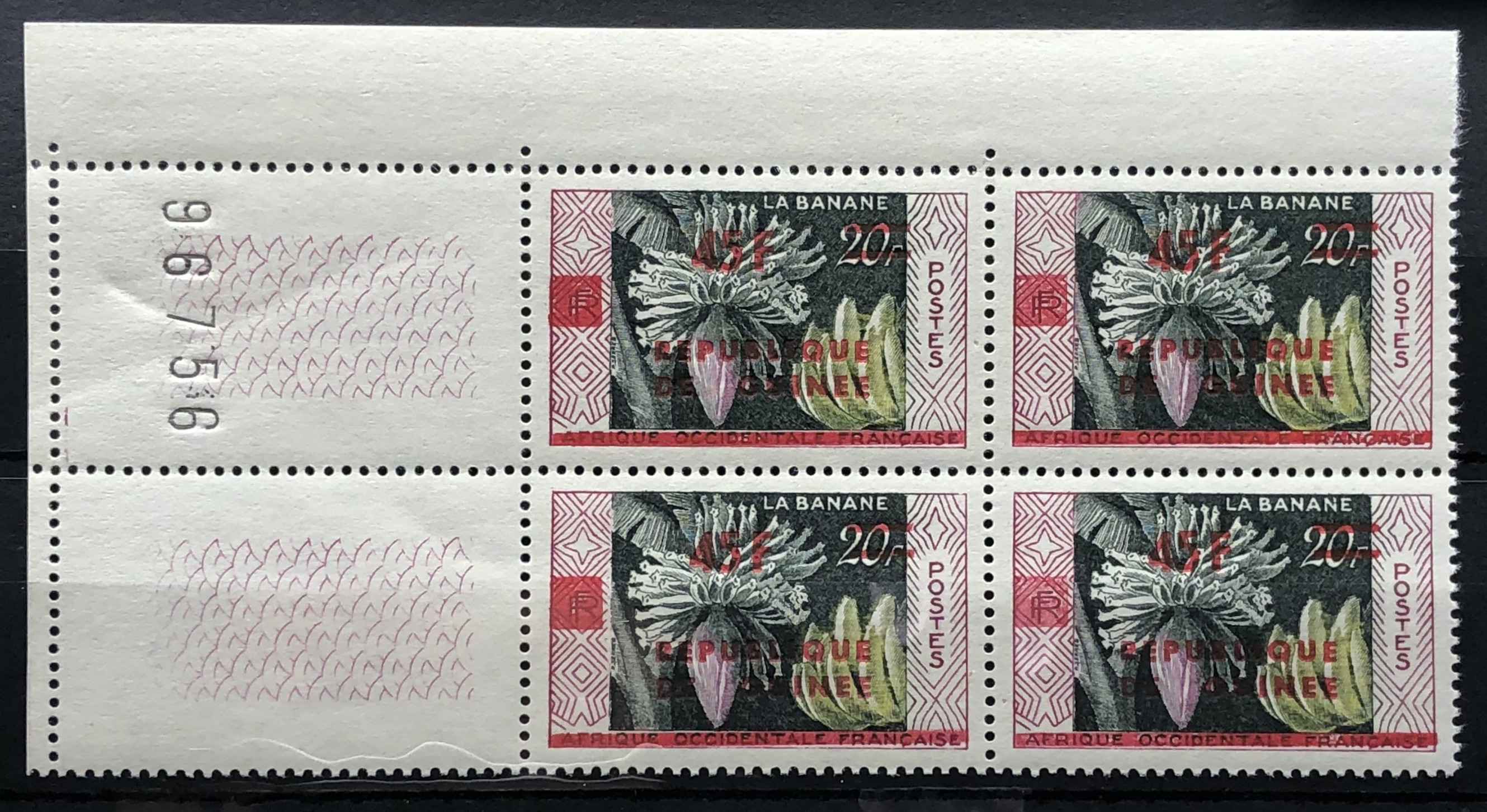 French West Africa No. 78 surcharged and overprinted in red, 1959. Block of 4.