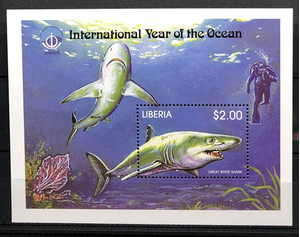 Great White Shark, International Year of the Ocean, 1998. Souvenir sheet.