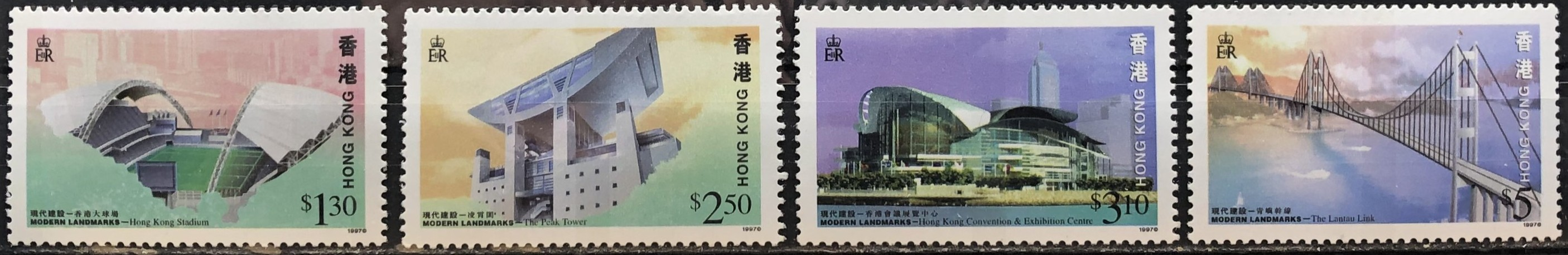 Landmarks: Hong Kong Stadium, The Peak Tower, Hong Kong Convention & Exhibition Center, The Lantau Link (bridge), 1997. Complete set of 4.