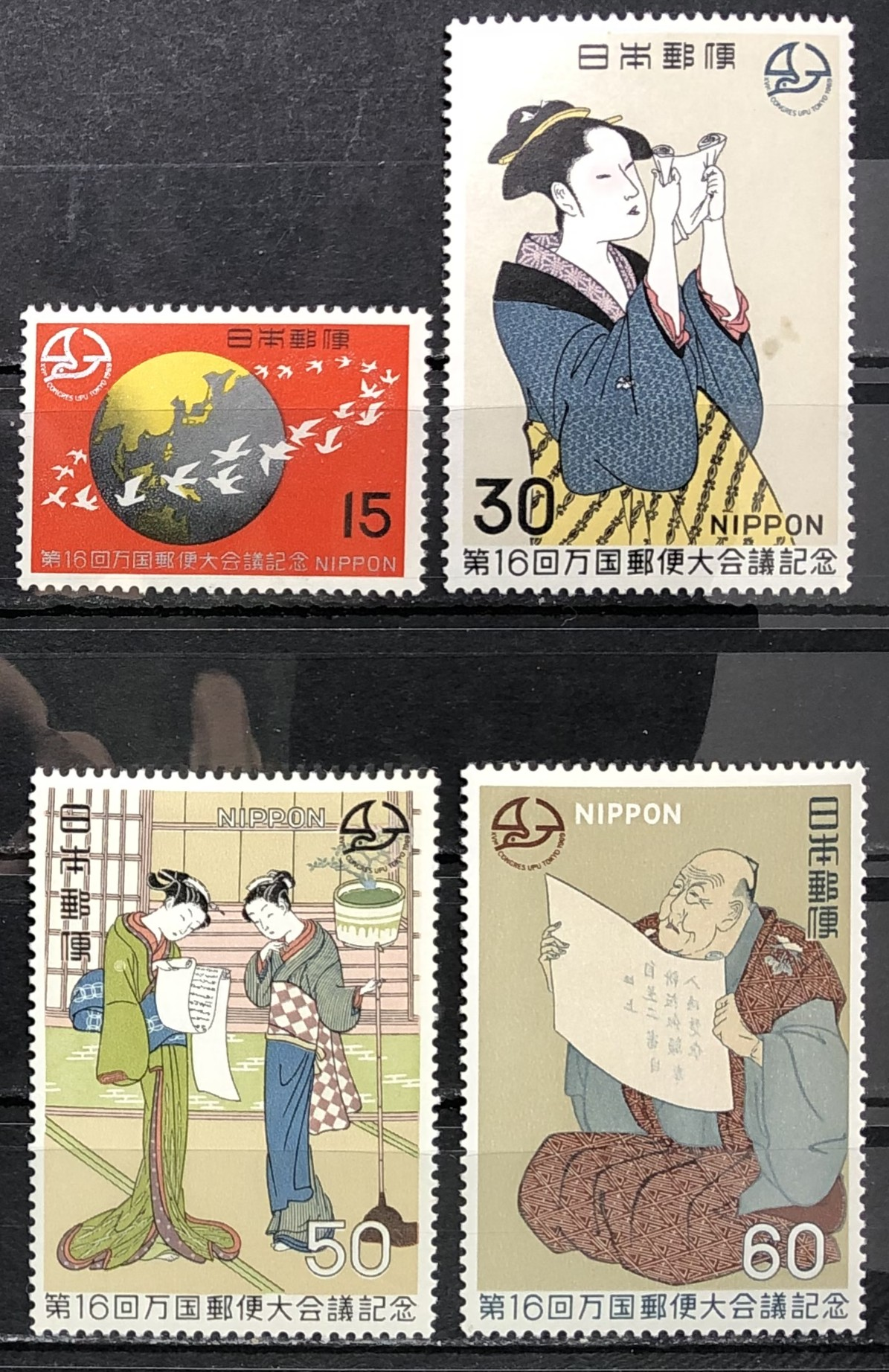 16th UPU Congress, Tokyo, 1969. Birds Circling Globe and UPU, Woman Reading Letter, Two Women Reading a Letter, Man Reading a Letter. Complete set of 4.