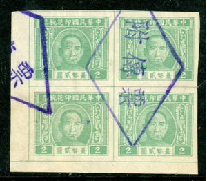 Free China 1946 Taiwan Revenue $2.00 Grey Lilac Imperf Margin Block VFU D442 ✔️