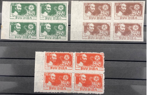 Ho Chi Minh and map of Vietnam 1951-55. Complete set of 3 blocks of 4. Numbers 1 and 2 imperf and number 3 perf as described in Scott cat.