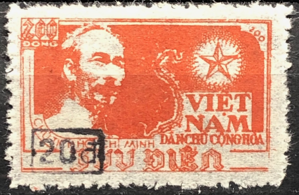 Surcharged 20d on 200d Ho Chi Minh and map of Vietnam 1954. Single.