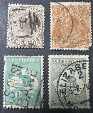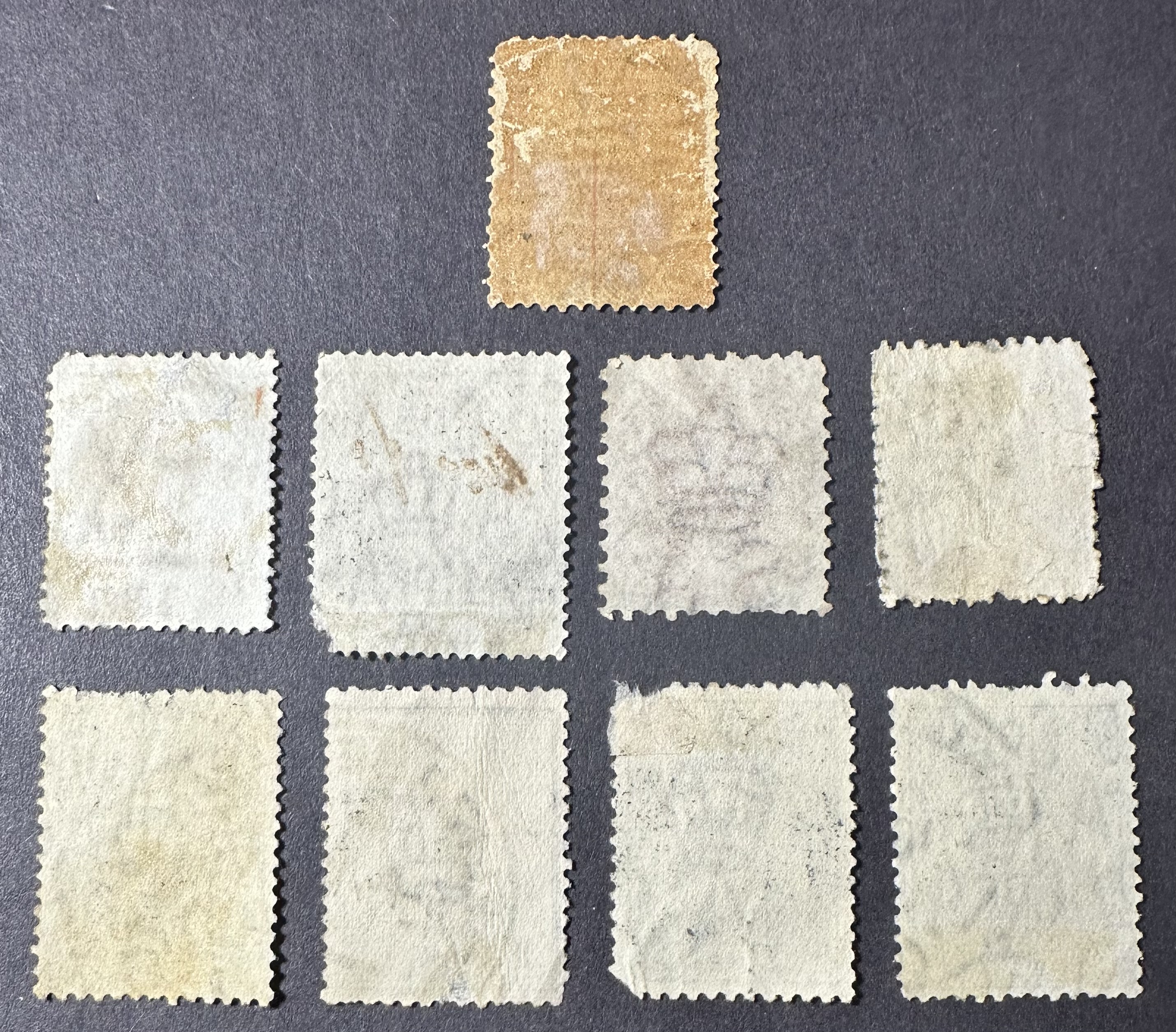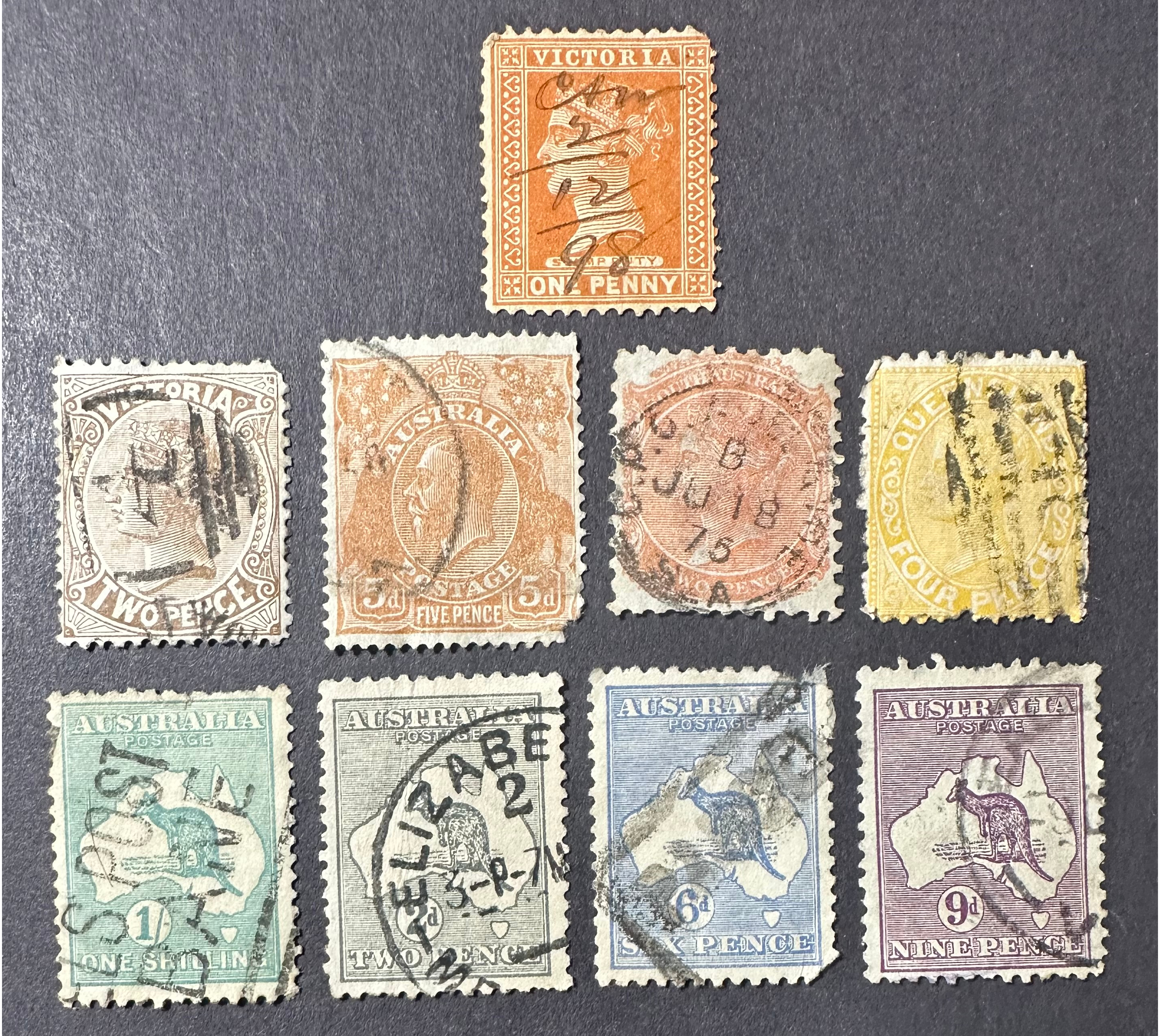 I have nine stamps total. 5 from Austraila which includes 4 used Kangaroos all of which are pre-1940's; 2 from Victoria one with the 1898 cancel; 1 from South Austraila from 1875; 1 from Queensland. Please see photos for condition issues. I revealed the two types of watermarks from the backs of the Kangaroos.