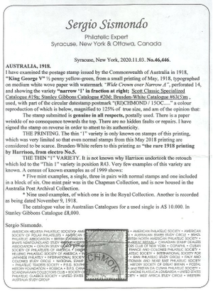 Scott #19a (SG #20d): 1918 1/2p Yell Green, Narrow "1" Centering & Condition: Used. Fine example of this Great Rarity. Reverse (Gum Side): N/A Faults / Imperfections: Minor paper wrinkle as noted on the certificate The item pictured is the actual item you are purchasing, unless otherwise noted. I also offer an interest-free layaway plan. Ask me about it!" All items will be mailed a day or two after payment is received. --------------------------------------------------------------------------------