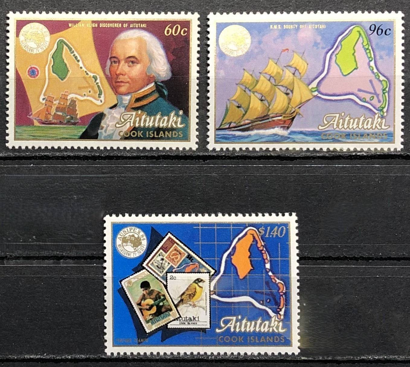 Ausipex '84, William Bligh & map, Bounty & map, stamps & map, 1984. Complete set of 3.