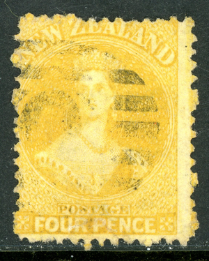 New Zealand 1865 QV 4p Yellow Perf 12½ Scott #35 VFU Q481