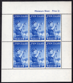 New Zealand Scott B55A. Miniature sheet of 6. Mint. Never hinged.