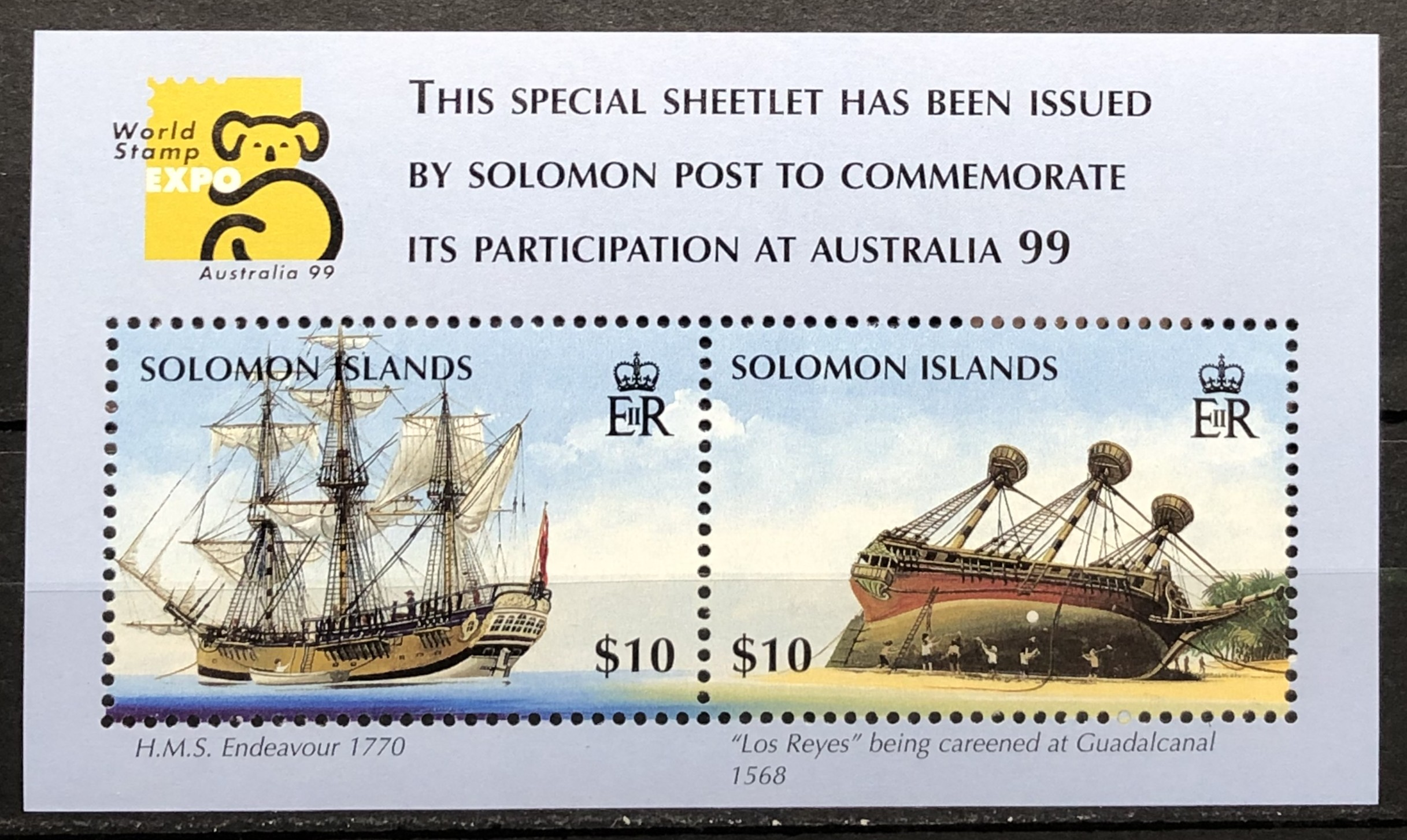 HMS Endeavour, Los Reyes being careened at Guadalcanal. Australia 99 World Stamp Expo, 1999. Sheet of 2.