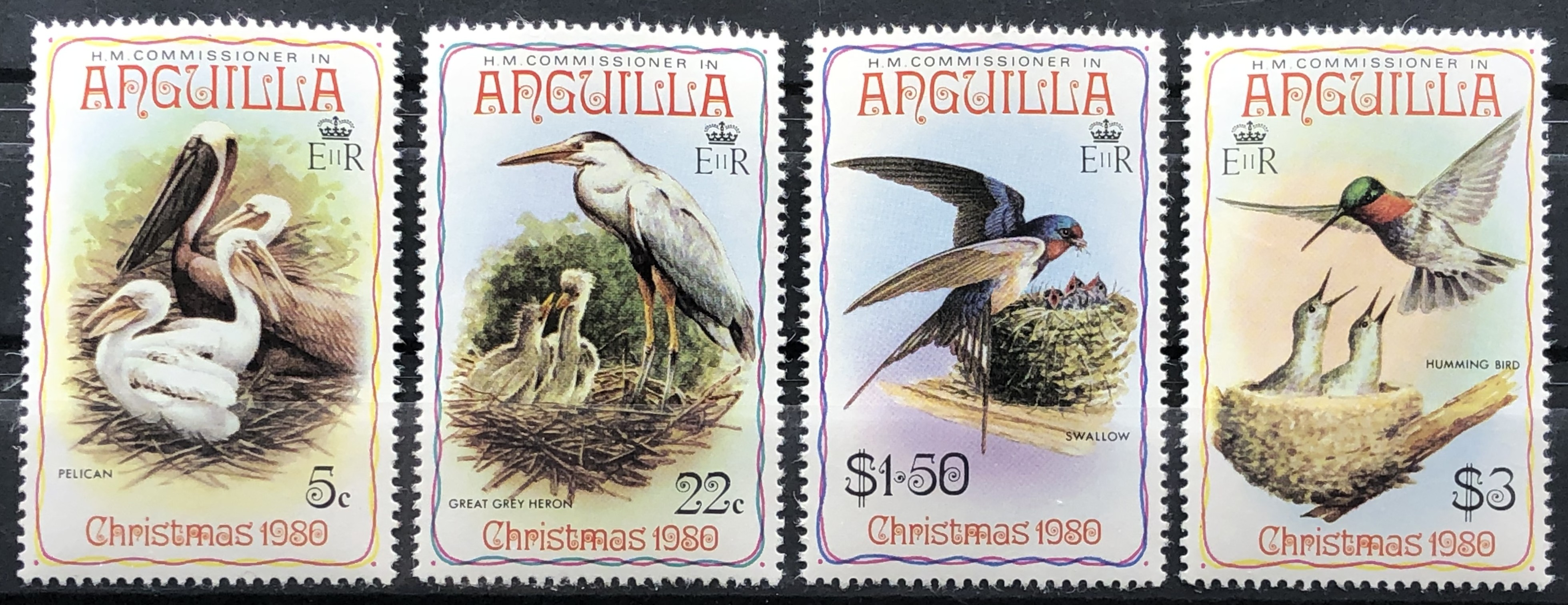 Christmas 1980, pilican, great gray herons, swallows, hummingbirds. Complete set of 4.