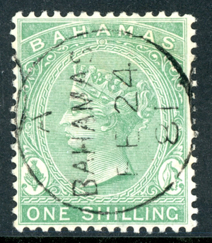 Bahamas 1880 QV One Shilling Green Wmk CCC Perf 14 Scott #19 VFU I208
