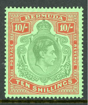 Bermuda 1936 KGVI 10 Shillings Brown Lake & Green Scott #126a Mint R42