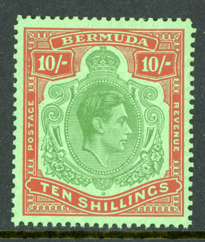 Bermuda 1951 KGVI 10 Shillings Red & Green Scott #126 MNH R46