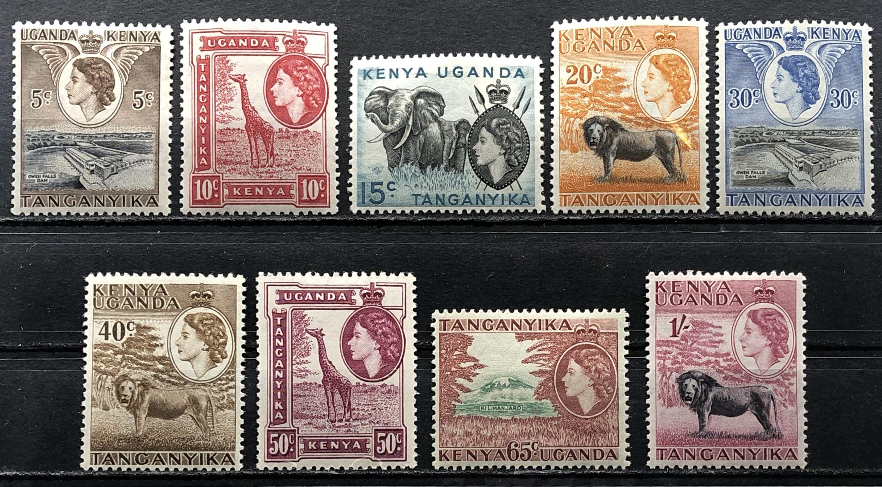 Elizabeth II, Owen Falls Dam, Giraffe, Mt. Kilimanjaro, Lion, Elephants, Royal Lodge, Sagana, 1954-59. Short set of 9.
