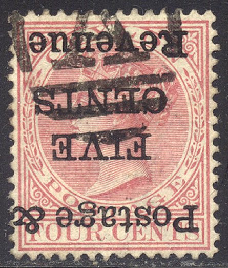 Scott #117a: 1885 5c on 4c Rose, Inverted Surcharge Centering & Condition: Used. Very Fine. Reverse (Gum Side): N/A Faults / Imperfections: None The item pictured is the actual item you are purchasing, unless otherwise noted. I also offer an interest-free layaway plan. Ask me about it!" All items purchased will be mailed a day or two after payment is received. --------------------------------------------------------------------------------