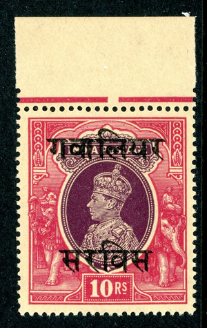British India 1945 KGVI Gwalior 10 Rupees Rose Carmine & Violet Scot #O51 MNH N3