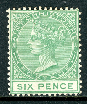 St Christopher 1876 British 6p Green CCC Perf 14 SG #9 Mint S3