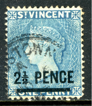 St. Vincent 1890 British Colony QV 2½/1p Milky Blue SG #56a VFU P2