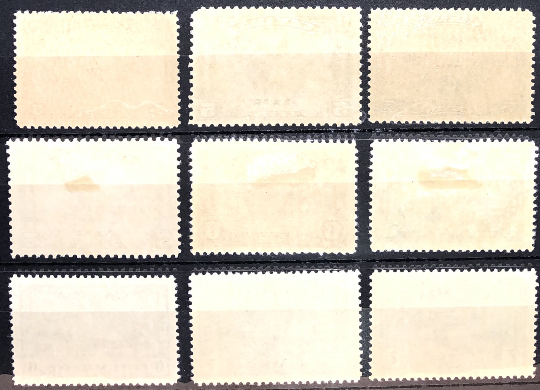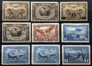 Air Post Stamps, 1930-46. All 9 Air Post Stamps including: Allegory of Flight, Allegory - Air Mail Circles Globe, 2 surcharges, Daedalus, Mackenzie River Steamer and Seaplane, Planes and Student Flyers, Canada Geese in Flight.