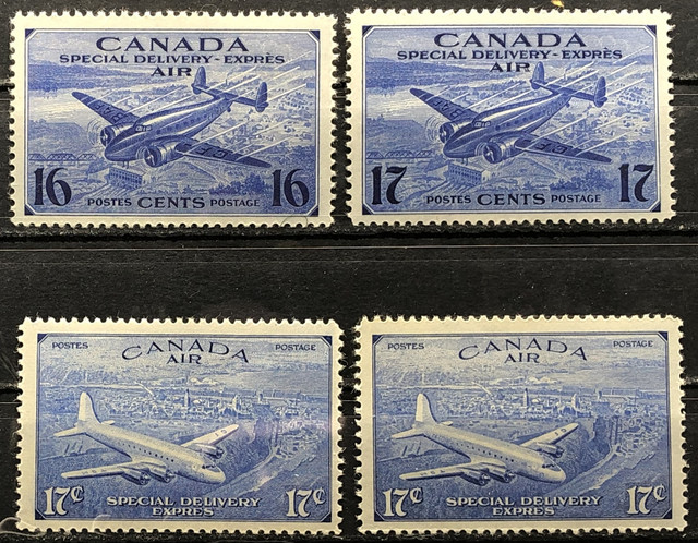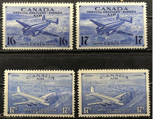 Air Post Special Delivery Stamps, 1942-46. 3 MNH (CE1, CE2, CE4) & 1 MH (CE3). Including: Trans-Canada Airplane and Aerial View of a City, DC-4 Transatlantic Mail Plane over Quebec.