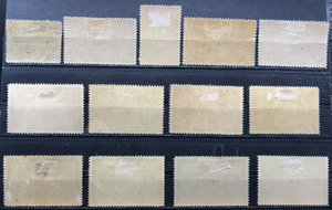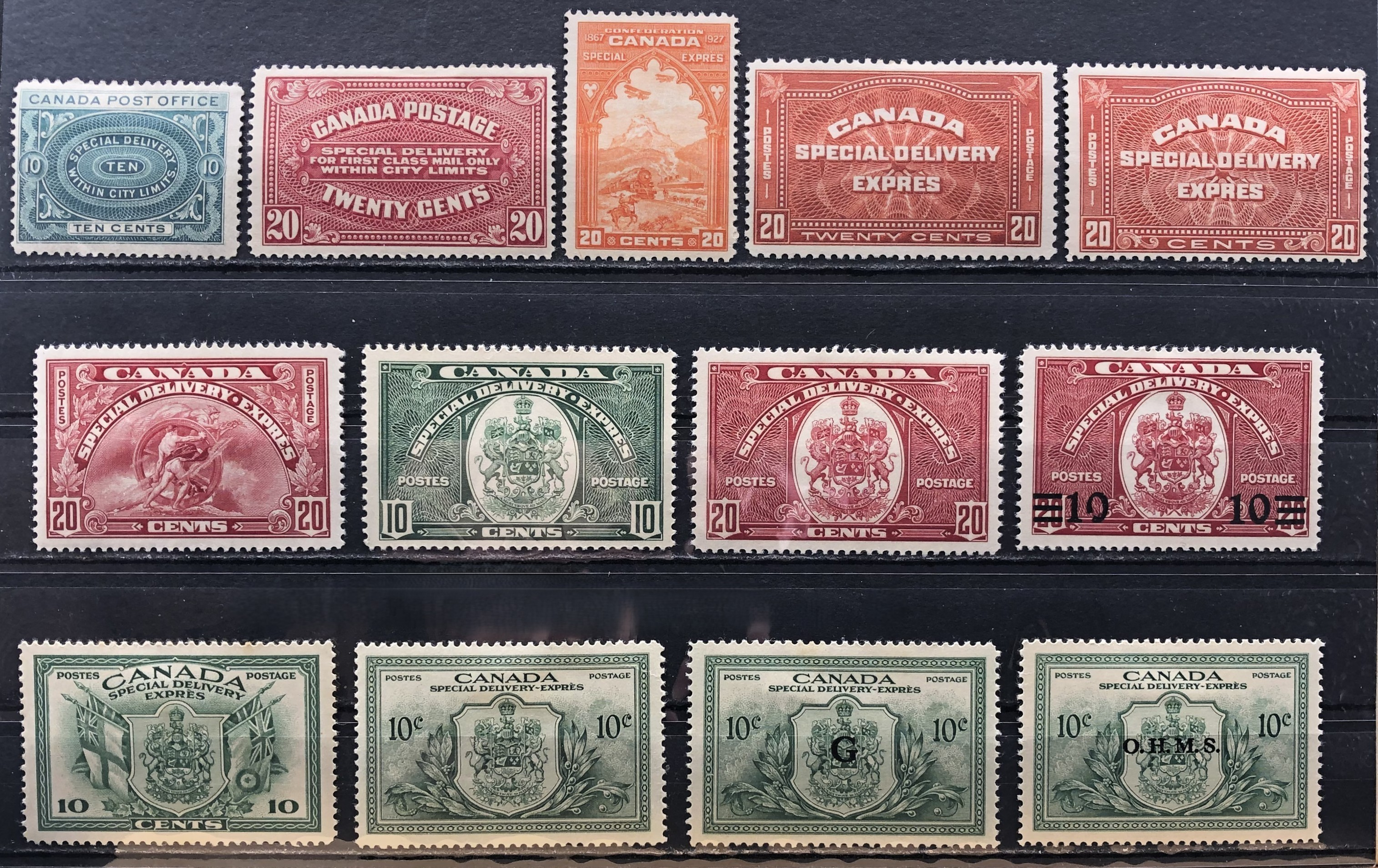 Special Delivery Stamps, all regular post (11) and all Officials (2), 1898-1950. See images for quality, hinge marks/remnants, crease on E1, and a few bits of paper debris stuck to the back of E10.