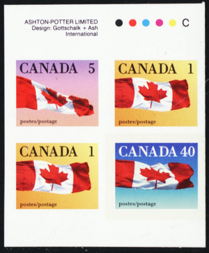 1990, Flags, 1c x2, 5c and 40c, imperforate se-tenant booklet pane of four, control signs and imprint at the top selvage, full OG, NH, VF, C.v. $1,350, Unitrade C.v. CAD $2,000