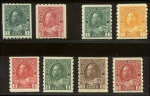 Scott #123-30: 1912-24 K G V, P 8 Coils Centering & Condition: Mint. Fresh. Fine-Very Fine Coil set. Reverse (Gum Side): Original gum. Never Hinged EXCEPT #128. Faults / Imperfections: None The item pictured is the actual item you are purchasing, unless otherwise noted. I also offer an interest-free layaway plan. Ask me about it!" All items will be mailed a day or two after payment is received. --------------------------------------------------------------------------------