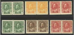 Scott #125-30: 1912-24 K G V Coils Centering & Condition: Mint. Fresh. Fine-Very Fine Coil Pairs. Reverse (Gum Side): Original gum. Never Hinged EXCEPT (1) #129. Faults / Imperfections: None The item pictured is the actual item you are purchasing, unless otherwise noted. I also offer an interest-free layaway plan. Ask me about it!" All items will be mailed a day or two after payment is received. --------------------------------------------------------------------------------