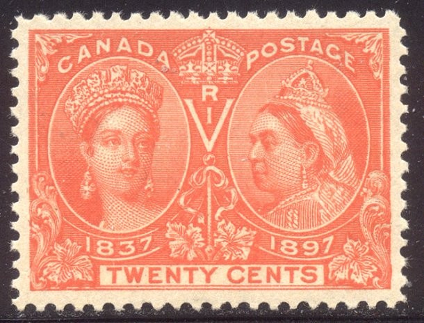 Scott #59: 1897 20c Vermilion Centering & Condition: Mint. Fresh. Brilliant color. XF/SUP and CHOICE! One of the nicest 20c Jubilees I have seen. Reverse (Gum Side): Original gum. Never Hinged. Faults / Imperfections: None The item pictured is the actual item you are purchasing, unless otherwise noted. I also offer an interest-free layaway plan. Ask me about it!" All items purchased will be mailed a day or two after payment is received. --------------------------------------------------------------------------------