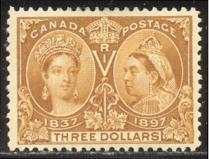 Scott #63: 1897 $3.00 Jubilee Centering & Condition: Mint. Fresh. Rich color. VF/XF and CHOICE! Reverse (Gum Side): Original gum. Lightly Hinged. Faults / Imperfections: None The item pictured is the actual item you are purchasing, unless otherwise noted. I also offer an interest-free layaway plan. Ask me about it!" All items purchased will be mailed a day or two after payment is received. --------------------------------------------------------------------------------