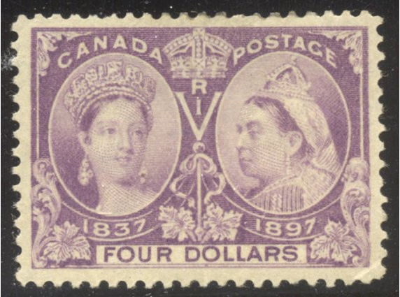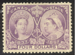 Scott #64: 1897 $4.00 Jubilee Centering & Condition: Mint. Fresh. Very Fine. Reverse (Gum Side): Original gum. Hinged. Faults / Imperfections: Tiny corner perf crease The item pictured is the actual item you are purchasing, unless otherwise noted. I also offer an interest-free layaway plan. Ask me about it!" All items will be mailed a day or two after payment is received. ![]() ![]() ![]() --------------------------------------------------------------------------------