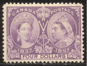 Scott #64: 1897 $4.00 Jubilee Centering & Condition: Mint. Fresh. Rich color. Near Very Fine. Reverse (Gum Side): Original gum. Lightly Hinged. Faults / Imperfections: None The item pictured is the actual item you are purchasing, unless otherwise noted. I also offer an interest-free layaway plan. Ask me about it!" All items purchased will be mailed a day or two after payment is received. --------------------------------------------------------------------------------