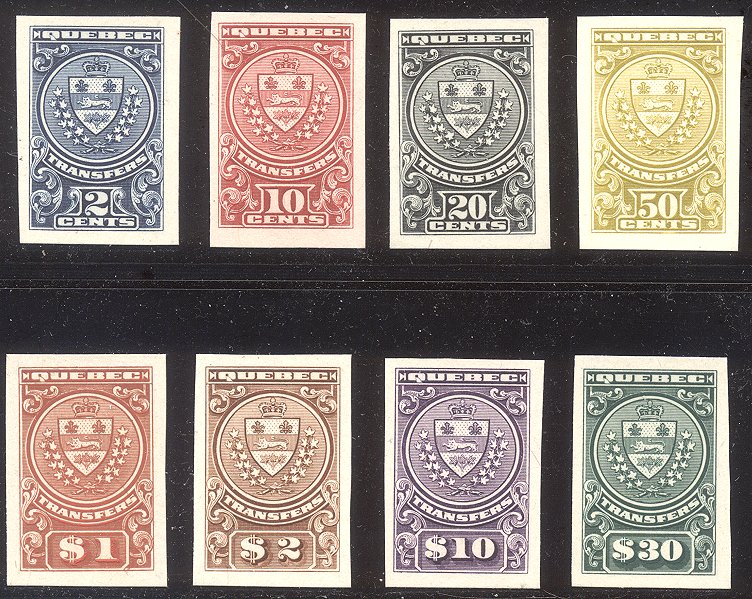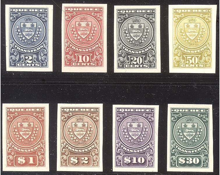 Scott #QST1-8P4: 2c - $30 Quebec Transfer Set Centering & Condition: Very Fine set of the SCARCE Card Proofs. Reverse (Gum Side): N/A Faults / Imperfections: None The item pictured is the actual item you are purchasing, unless otherwise noted. I also offer an interest-free layaway plan. Ask me about it!" All items will be mailed a day or two after payment is received. ![]() ![]() ![]() ![]() ![]() --------------------------------------------------------------------------------