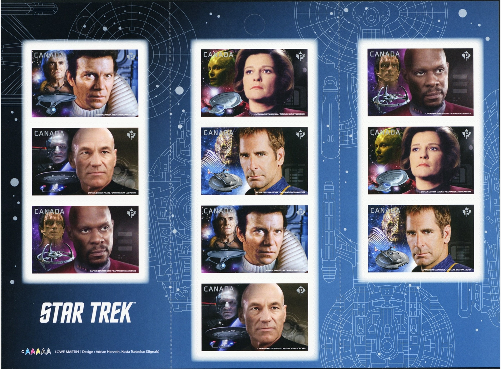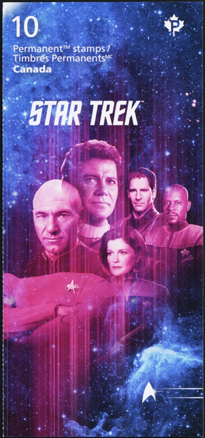 Enjoy the company of some of the finest leaders that Starfleet Academy has ever produced in this booklet of 10 Permanent™ stamps. Representing each generation, this booklet contains two Permanent stamps of: James T. Kirk (Canadian William Shatner), Jean-Luc Picard (Patrick Stewart), Benjamin Sisko (Avery Books), Kathryn Janeway (Kate Mulgrew) and Jonathan Archer (Scott Bakula).