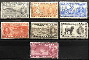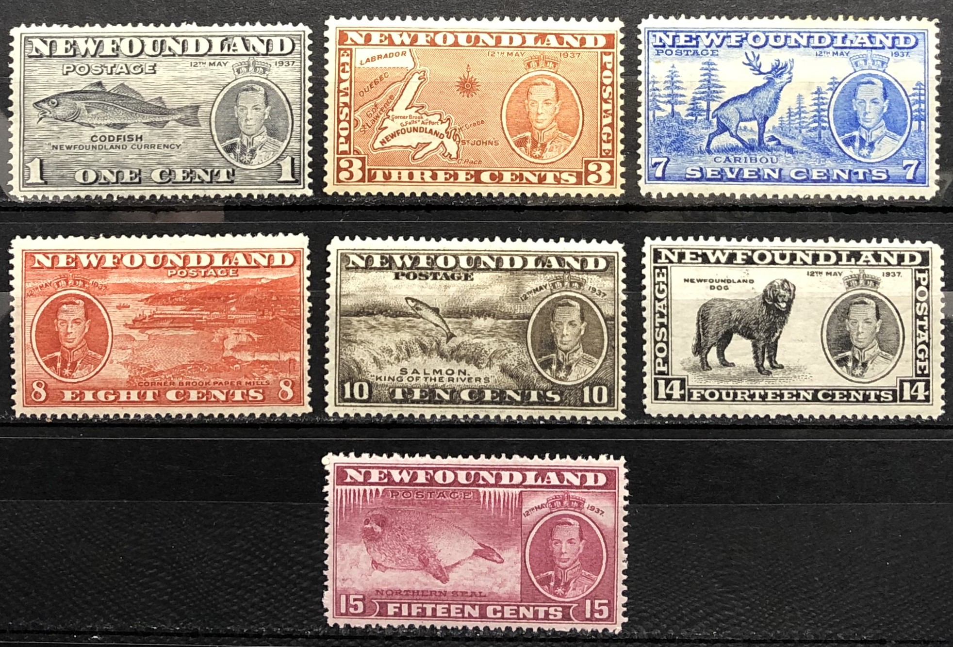 Codfish, Map of Newfoundland, Caribou, Corner Brook Paper Mills, Salmon, Newfoundland Dog, Harp Seal Pup, 1937. Partial set of 7. Some with ripples in gum or disturbed gum.