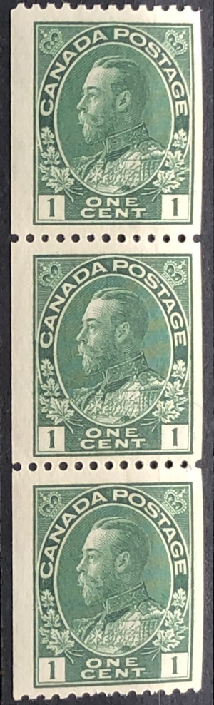 King George V, coil stamp, perf 8 horizontally. Strip of 3.