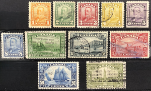 King George V, Mt. Hurd, Quebec Bridge, Harvesting Wheat, Schooner "Bluenose," Parliament Building, 1928-29. Complete set of 11. Printing fault on #159, white lines and background area?