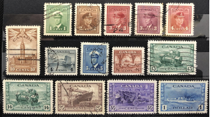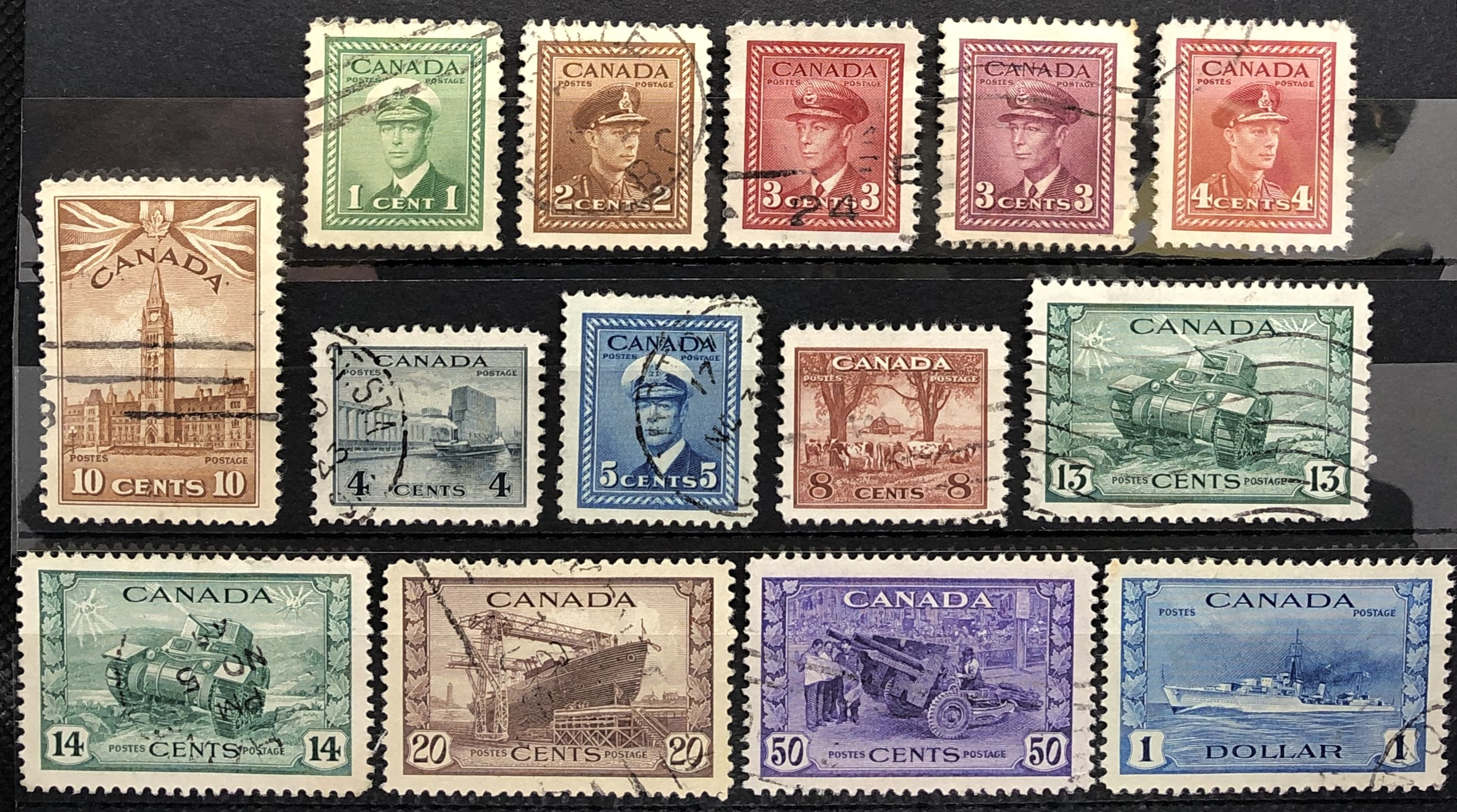 King George V, Grain Elevators, Farm Scene, Parliament Buildings, "Ram" Tank, Corvette, Munitions Factory, Destroyer, 1942-43. Complete set of 14.