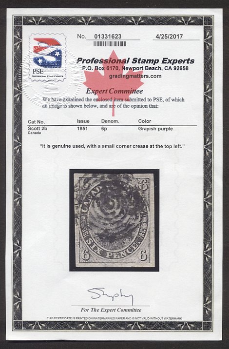 Scott #2b: 1851 6p Grayish Purple Centering & Condition: Used. Very Fine. a PSE Certificate accompanies. Reverse (Gum Side): N/A Faults / Imperfections: Certificate notes a small corner crease. It is very light and barely visible in fluid. The item pictured is the actual item you are purchasing, unless otherwise noted. I also offer an interest-free layaway plan. Ask me about it!" All items purchased will be mailed a day or two after payment is received. -------------------------------------------------------------------------------- Please click any of the following to read: |