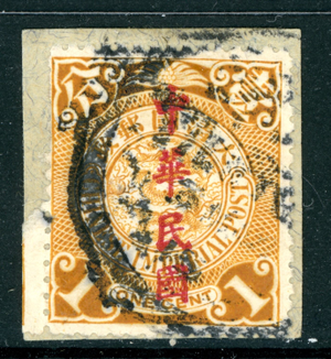 China 1912 Imperial 1¢ Ocher Coiling Dragon London Overprint Sc #164 VFU K213