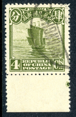 China 1926 Republic 4¢ Olive Green Second Peking Junk VFU k375