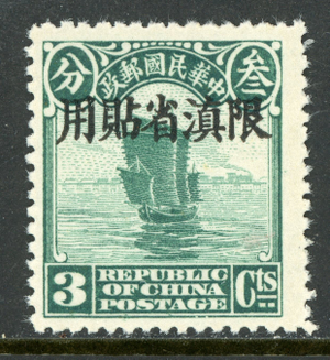 China 1926 Yunnan 3¢ Green Junk Thick Paper Scott #5 MNH R586