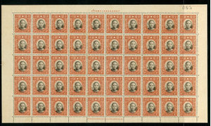 These stamps were printed at the beginning of the war, after the normal Chung Hwa Printing were done. The Chung Hwa printing of 1939 were printed without watermark (Perf 12½) in either Die 1, 2 or 3. These were printed in 1941 (Perf 12½) on WATERMARKED paper (Wmk was the character yu.) The button on the collar of SYS is perfect in the first first row and progresses to a half or "imperfect" button in the last four rows. They are listed as 376-380 in the Scott catalog without any distinction between the "perfect" full button and the "imperfect" half button. The China stamp society has separate listings for the perfect and imperfect buttons. The full sheet has the advantage of showing the progression of the change in printing from perfect to imperfect. The top frames are fully shaded on all stamps. (Be careful of the Dah Tung printing with Watermark which is perforation 14).