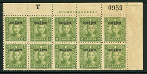 Mint Top Right Corner Block of ten with Chinese Imprint and Accounting number. . Toned gum. Unlisted in Scott catalogue. Unlisted in Chan catalog. Unlisted in China Stamp Society Catalog. Unique and a positional piece.
