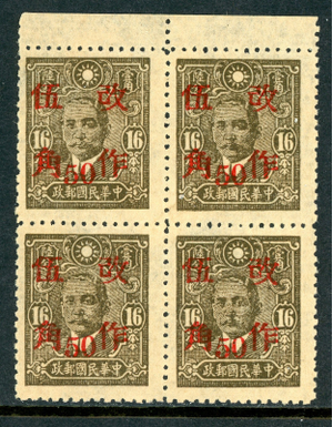 China 1943 Wartime 50¢/16¢ East Szechwan Scott 530f50 Mint BLOCK N586