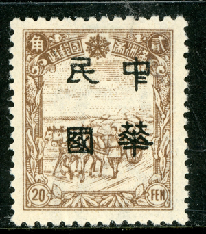 When the change in currency took place the domestic letter rate was 10 Manchukuo fen, after 15th January 1946 this changed to 1 North-Eastern Yuan, essentially half the rate.  This currency change is likely to be the reason for the many surcharged issues and would logically indicate that surcharged stamps date from after January 1946, this might or might not be the case.