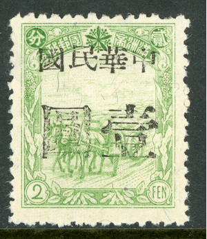 When the change in currency took place the domestic letter rate was 10 Manchukuo fen, after 15th January 1946 this changed to 1 North-Eastern Yuan, essentially half the rate.  This currency change is likely to be the reason for the many surcharged issues and would logically indicate that surcharged stamps date from after January 1946, this might or might not be the case.