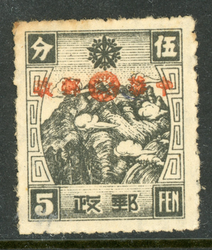 When the change in currency took place the domestic letter rate was 10 Manchukuo fen, after 15th January 1946 this changed to 1 North-Eastern Yuan, essentially half the rate.  This currency change is likely to be the reason for the many surcharged issues and would logically indicate that surcharged stamps date from after January 1946, this might or might not be the case.