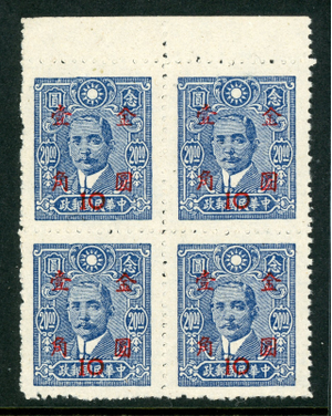 China 1949 Republic Gold Yuan 10ยข/$20.00 Block Sc #836 Mint U273